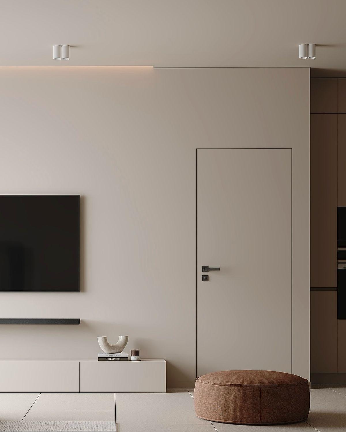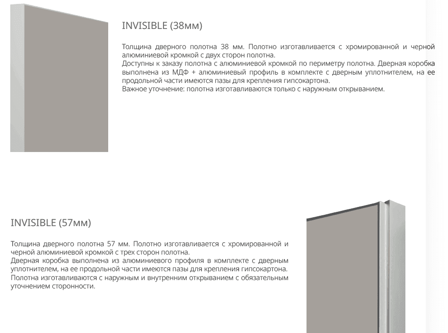 Дверь-невидимка Invisible с алюминиевой кромкой. ( 3 вида кромки) Конструктив короба INVISIBLE позволяет установить дверное полотно в одной плоскости со стеной, без обрамления проема наличниками, создавая тем самым эффект невидимой двери. Усиливает эффект одинаковая отделка полотна двери и стен. Высота изготавливается до 2300, с шагом 50. В комплекте (скрытые петли, замок)